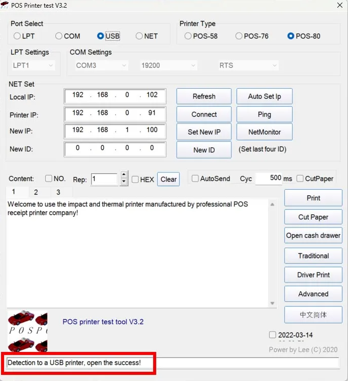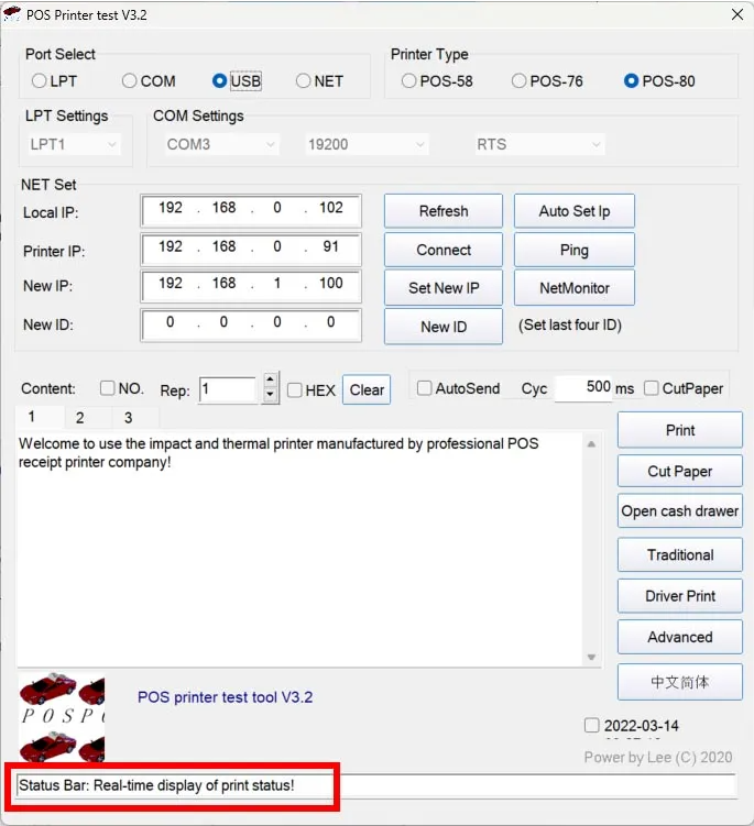 Khởi chạy phần mềm “POS Printer Test“, trên giao diện chính của phần mềm, bạn hãy đảm bảo rằng: