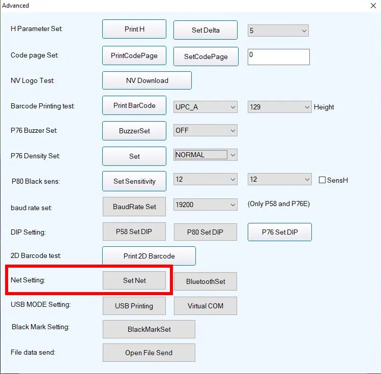 Trên cửa sổ Advance của phần mềm Công cụ cài đặt máy in hóa đơn, bạn hãy nhấn vào nút Set Net để mở cửa sổ Net Setting.