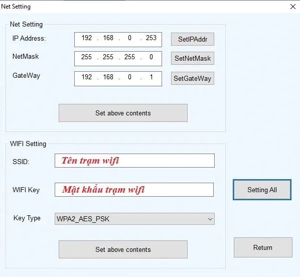 Sau khi điền đẩy đủ, bạn hãy nhấn vào Setting All để thiết lập các thông số cho máy in. Máy in sẽ kêu và sau đó tự khởi động lại. Bạn có thể Ping thử để biết máy in của bạn đã được kết nối thông chưa. Hoặc sau khi bạn tắt máy in và bật lại, máy in XP-K200W không in ra giấy hướng dẫn kết nối.