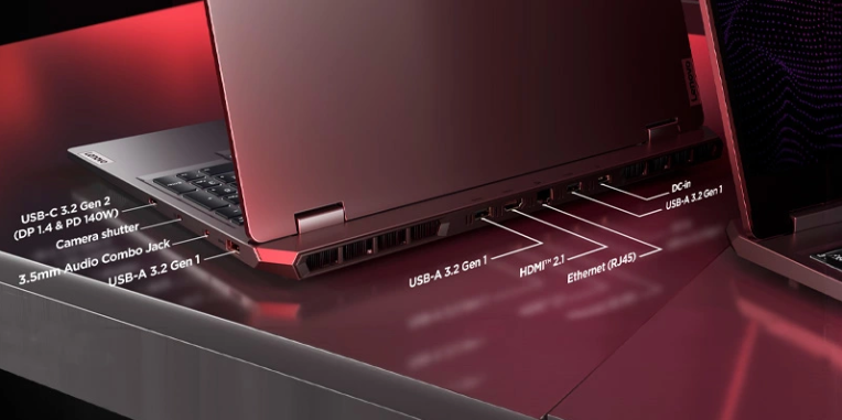 Máy có các cổng USB Type-A, USB Type-C hỗ trợ xuất hình ảnh, HDMI, jack mạng LAN và các cổng âm thanh 3.5mm. Cách bố trí này mang lại sự tiện lợi và linh hoạt khi kết nối với màn hình phụ, thiết bị lưu trữ ngoài hoặc tai nghe gaming.