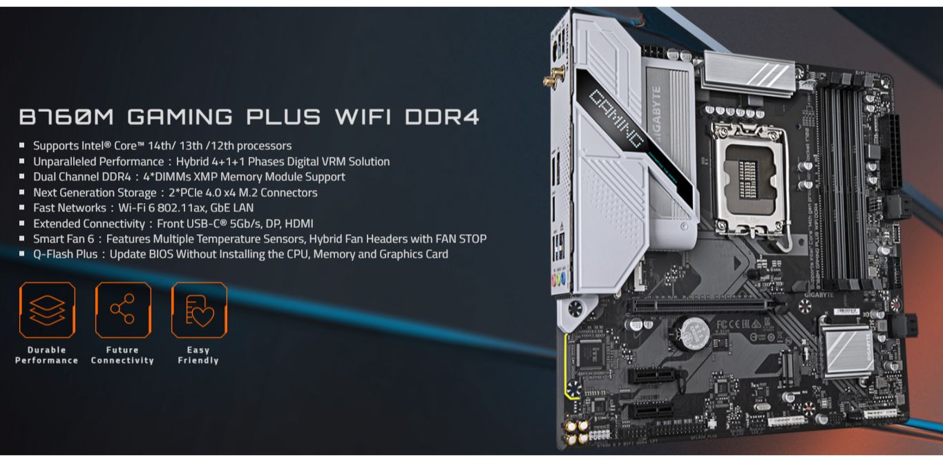 - WiFi tích hợp: Với WiFi tích hợp, mainboard Gigabyte B760M GAMING PLUS WIFI DDR4 mang lại khả năng kết nối không dây ổn định và nhanh chóng, giúp bạn dễ dàng truy cập internet mà không cần thêm card WiFi.