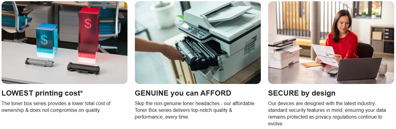 Hộp mực lớn với công nghệ mới sử dụng mực polime hóa với nhiệt độ thấp giúp tiết kiệm được điện năng tiêu thụ so với các dòng máy in khác cho phép người dùng giảm dung tích mực in trên mỗi bản in mà vẫn cho độ sắc nét cao