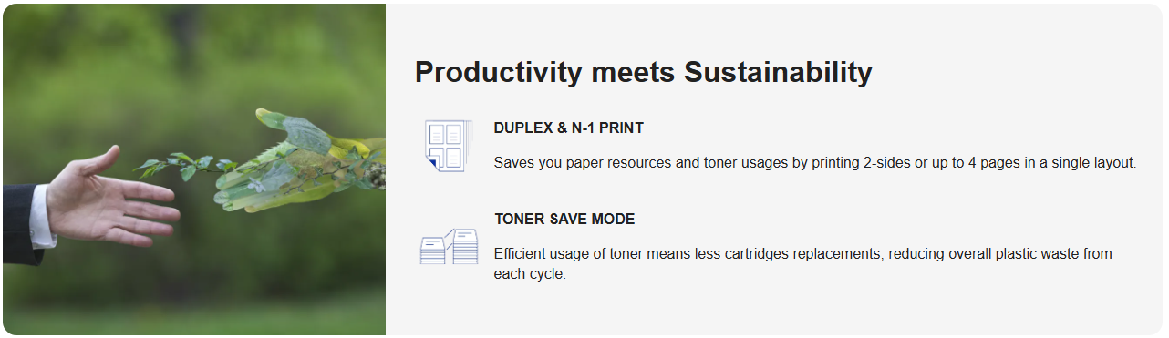 Ngoài ra máy trang bị tính năng in hai mặt sẽ giúp giảm thời gian thao tác và lượng giấy in sử dụng góp phần bảo vệ môi trường.