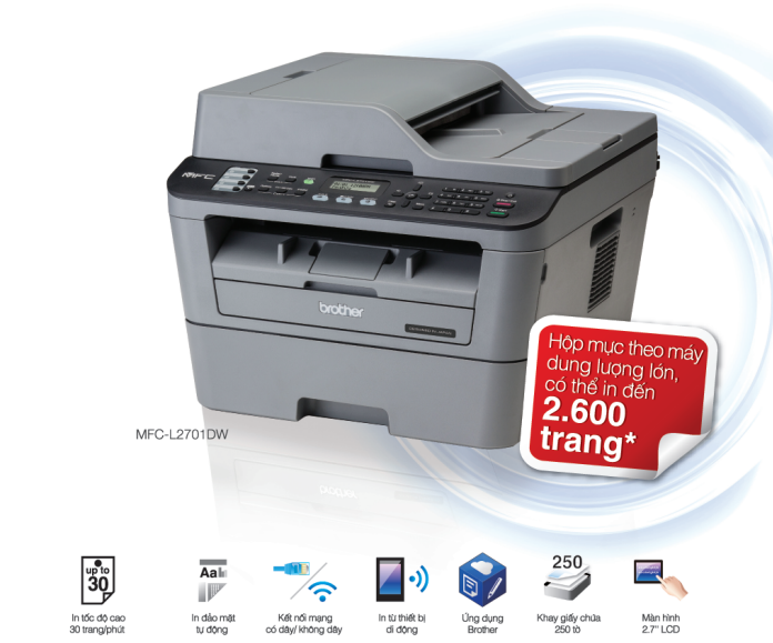 Máy in Brother MFC-L2701DW thường được sử dụng trong các văn phòng vừa và nhỏ. Với máy in đa chức năng này bạn có thể linh hoạt sử dụng tùy vào mục đích của mình, từ in scan copy…. Máy in Brother MFC-L2701DW còn trang bị khả năng kết nối không dây tiện lợi, kết nối trực tiếp với điện thoại, máy tính bảng nhờ vào iPrint & Scan.