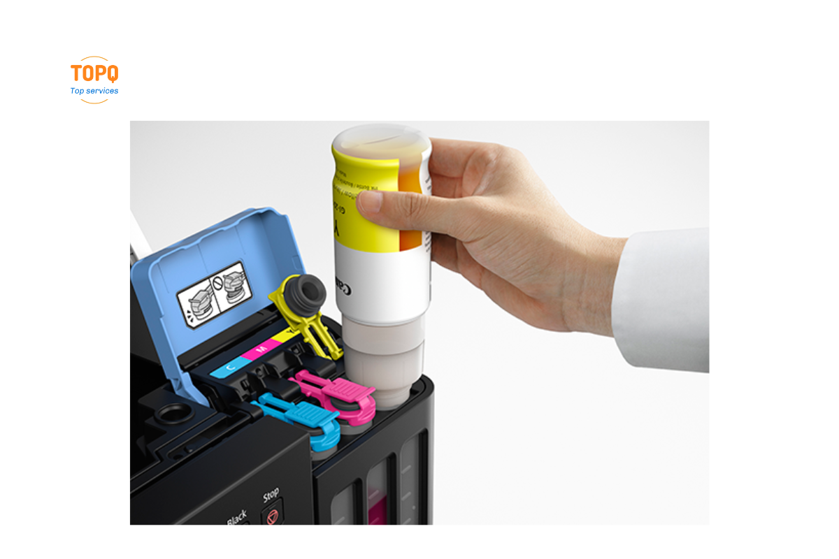 Bình mực được thiết kế đặc biệt để tránh tràn mực ra ngoài. Mực nạp tự động dừng khi mức lượng mực bên trong chạm tới nắp bình.