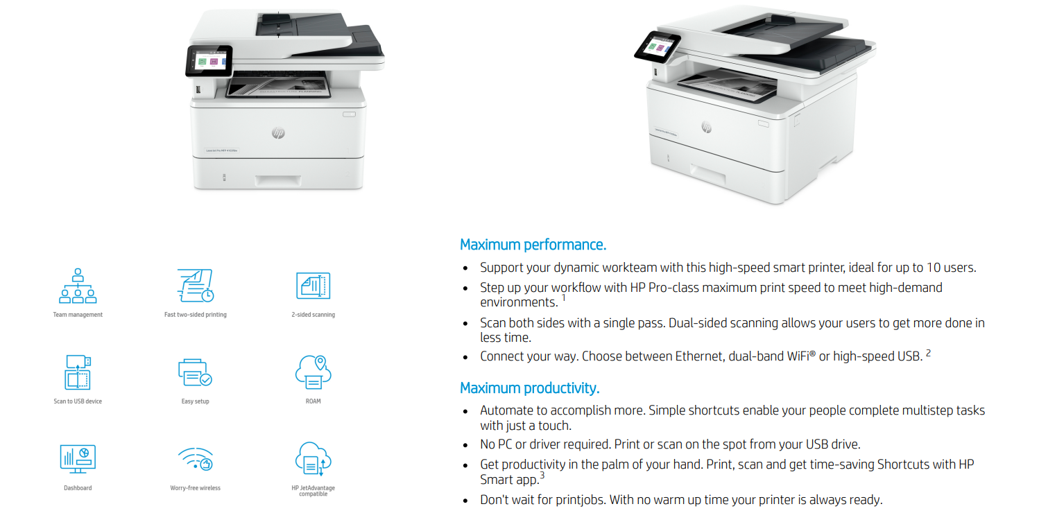 Dễ dàng thiết lập và quản lý nhóm máy in HP được kết nối đám mây của bạn, dù chúng ở đâu, với một bảng điều khiển dựa trên web duy nhất - Quản trị viên thông minh. Với các tính năng kết nối mạnh mẽ và công cụ quản lý thông minh, máy in đa năng HP LaserJet Pro MFP 4103fdn (2Z636A) của bạn luôn sẵn sàng khi bạn cần.