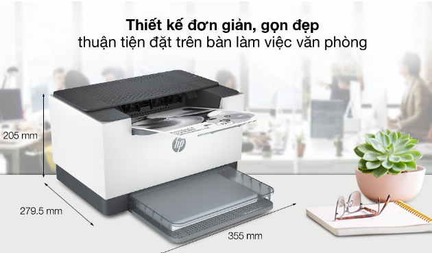 HP LaserJet M211d (9YF82A) mang kích thước nhỏ gọn, phù hợp lắp đặt trên bàn làm việc, kệ tủ với chiều dài 355 mm, rộng 279.5 mm, cao 205 mm và khối lượng chỉ 5.6 kg. Thiết kế tông màu trắng đen đơn giản, thanh lịch, dùng tốt cho mọi không gian.