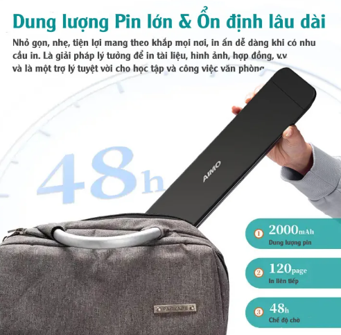 Máy in bluetooth không dây AIMO P832 ngang với kích thước của hai điện thoại di động. Nó có thể dễ dàng bỏ vào túi hoặc cặp của bạn, thuận tiện cho việc vận chuyển. Cho dù bạn đang đi công tác, công tác, ở văn phòng, ở nhà, trên ô tô hay ở trường đại học, máy in du lịch này là sự lựa chọn tuyệt vời để in tại chỗ từ bất cứ đâu.
